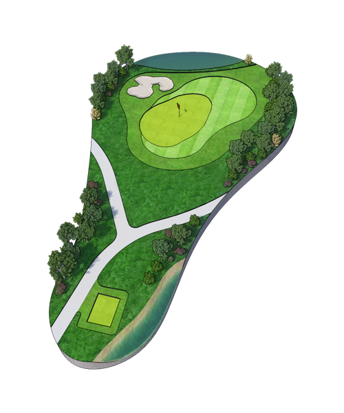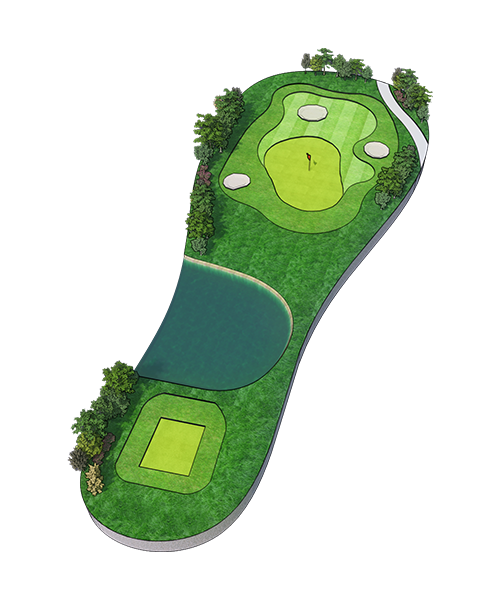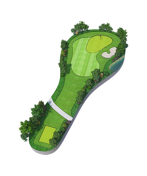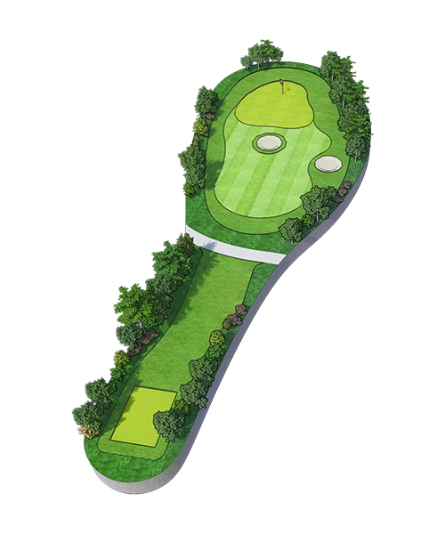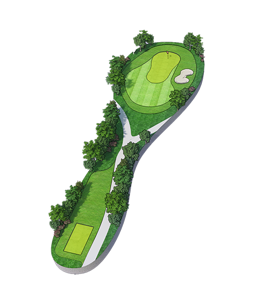 2단 그린으로 난이도를 적용하였다. 아랫단과 윗단의 단차는 0.5미터이며 각 단은 라이가 거의 없어 퍼팅 공략이 용이하다. 길게 늘어진 그린으로 정확한 거리 공략이 필요하다. 그린에 올라가지 못하더라도 그린 앞 충분한 어프로치 공간이 있어 안정적인 홀 공략이 용이하다. 티에서 그린을 바라볼 때 그린 후면의 아파트 풍경과 아카시아 나무가 병풍처럼 감겨 있어 도심에서 즐기는 이색적인 감흥을 느낄 수 있을 것이다.