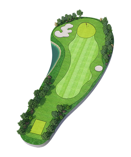 230미터 파4로 운영 가능하다. 하지만 7번 이하 아이언으로 티샷을 해야 하며 다음은 어프로치 그린 공략이 필요하다. 홀의 왼쪽으로는 길게 워터 헤저드가 펼쳐져 있고, 페어웨이는 편안한 랜딩이 가능한 존이다. 골퍼들에게 도전은 선택이지만, 성공하지 못할 경우 그 결과에 실망할 수 밖에 없는 도전적인 홀이다. 그린 옆에는 길게 늘어진 조형미 넘치는 벙커가 위치해 있어 그린 공략 역시 녹녹치 않다. 워터 헤저드 왼쪽은 원형 수목들이 길게 펼쳐져 있어 조경미가 매우 뛰어나다.